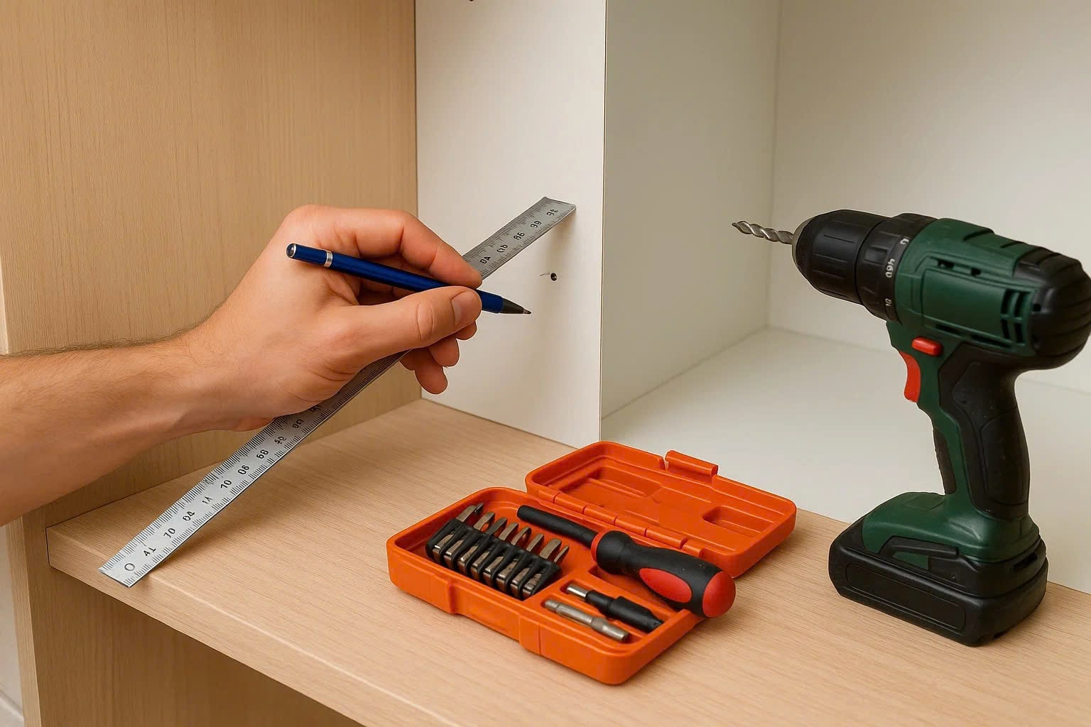 Dùng thước đo và bút đánh dấu chính xác các vị trí gắn ray trượt và giá đỡ. Lưu ý: nên chừa khoảng cách từ mặt đáy tủ lên tối thiểu 2–3cm để tránh cạ sàn.