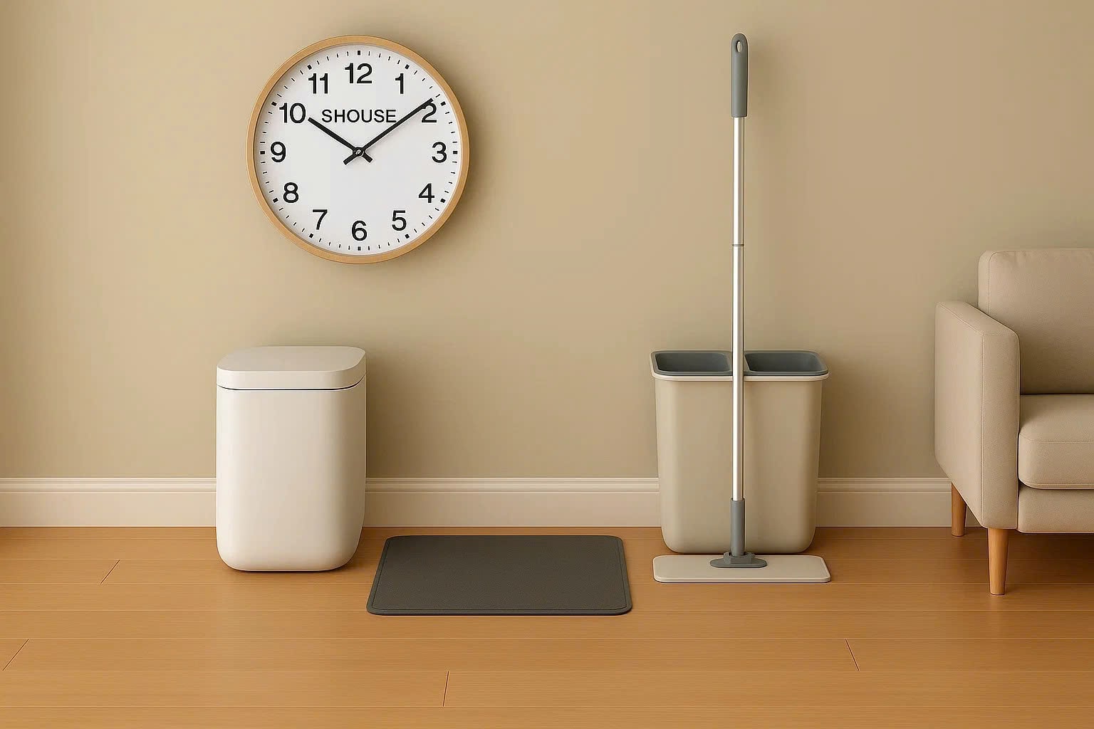 Khi bố trí không gian sống, việc phối hợp đồng hồ treo tường với các vật dụng khác như thùng rác thông minh, thảm lau chân hay bộ lau nhà sẽ tăng tính tiện nghi và đồng bộ thẩm mỹ cho không gian.