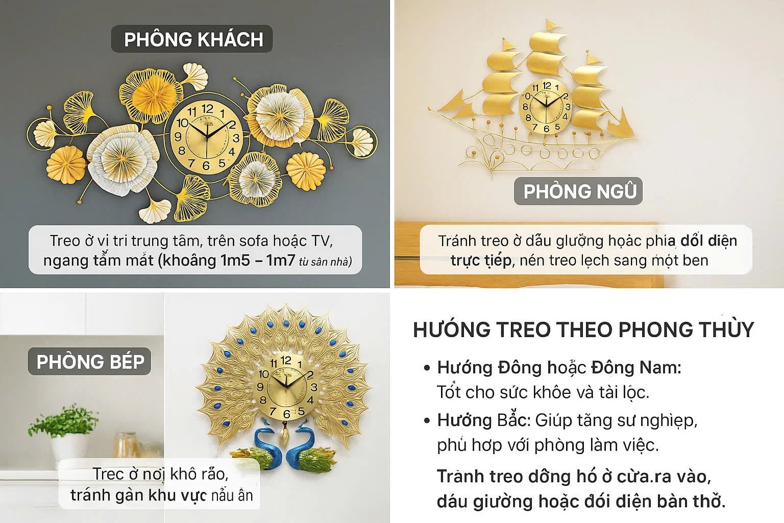 Phòng ngủ: Tránh treo ở đầu giường hoặc phía đối diện trực tiếp, nên treo lệch sang một bên để không tạo áp lực thời gian khi ngủ.