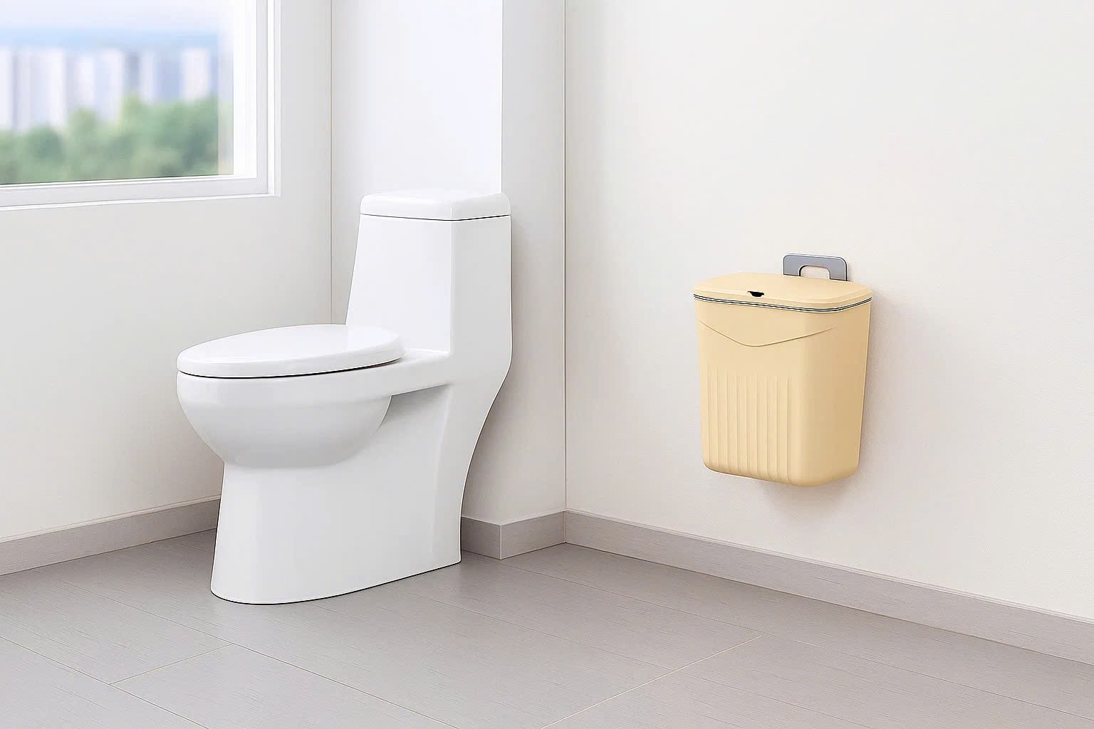 Màu sắc & kiểu dáng: Nên chọn tông màu trung tính, đồng bộ với nội thất. Ví dụ, thùng rác màu xám nhạt hoặc trắng sẽ hài hòa với nền nhà có thảm xốp ghép hoặc thảm lau chân màu sáng.