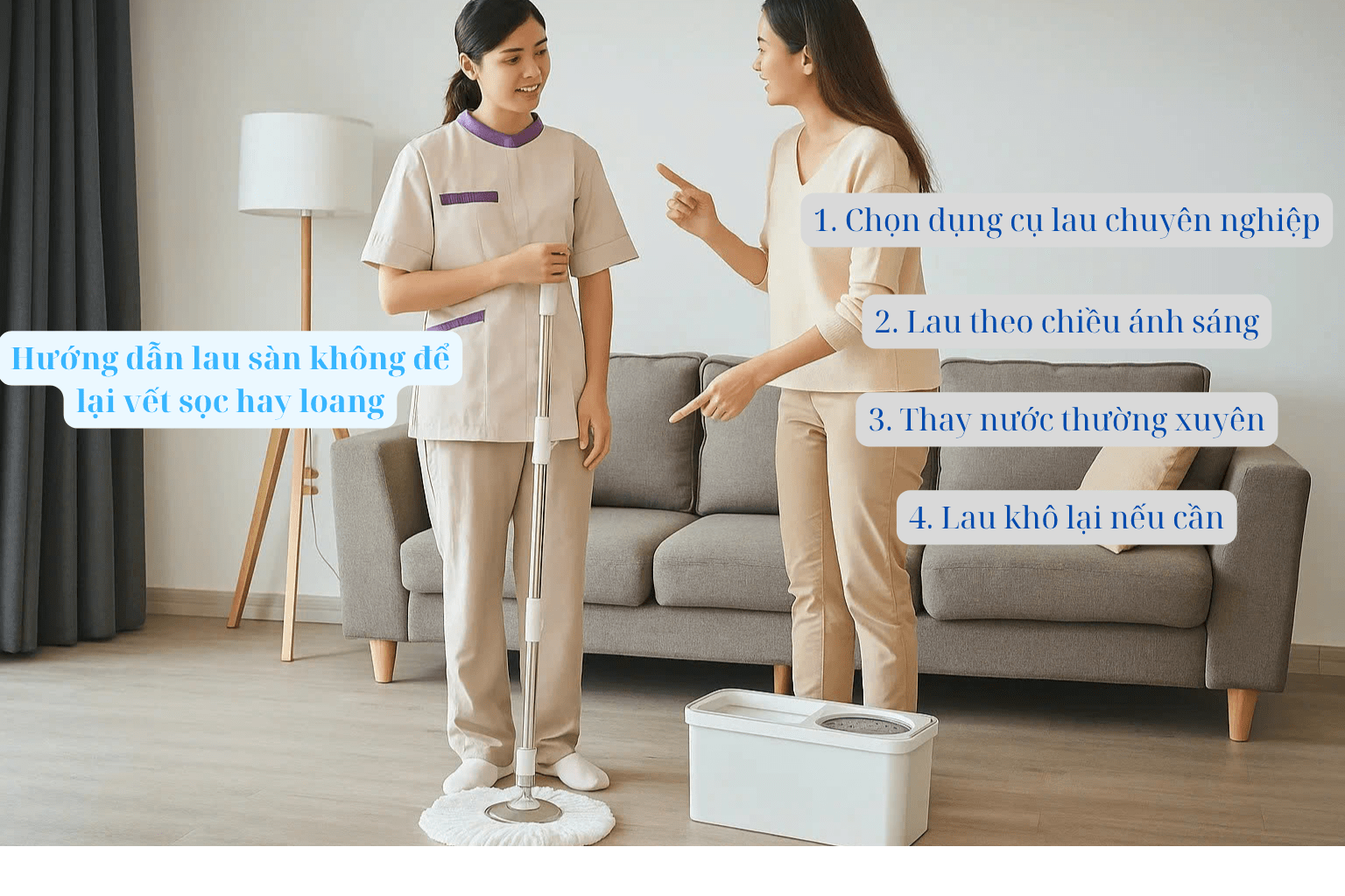 Sau mỗi khoảng 10–15 m² sàn, hãy thay nước mới để đảm bảo bông lau không bị dơ. Việc tiếp tục lau bằng nước bẩn là nguyên nhân chính gây ra vết sọc.