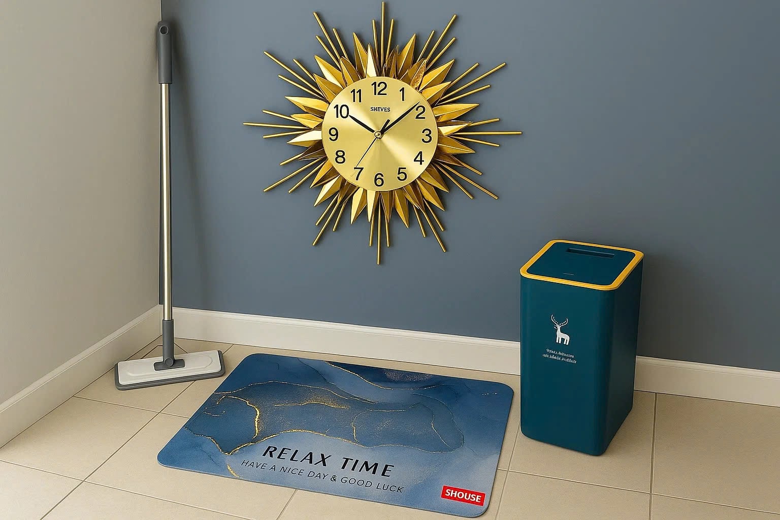 Ngoài ra, đừng quên trang bị thêm những vật dụng cần thiết khác như thảm lau chân, thùng rác, hay đồng hồ treo tường trang trí để không gian sống thêm tiện nghi, gọn gàng và ấm cúng.