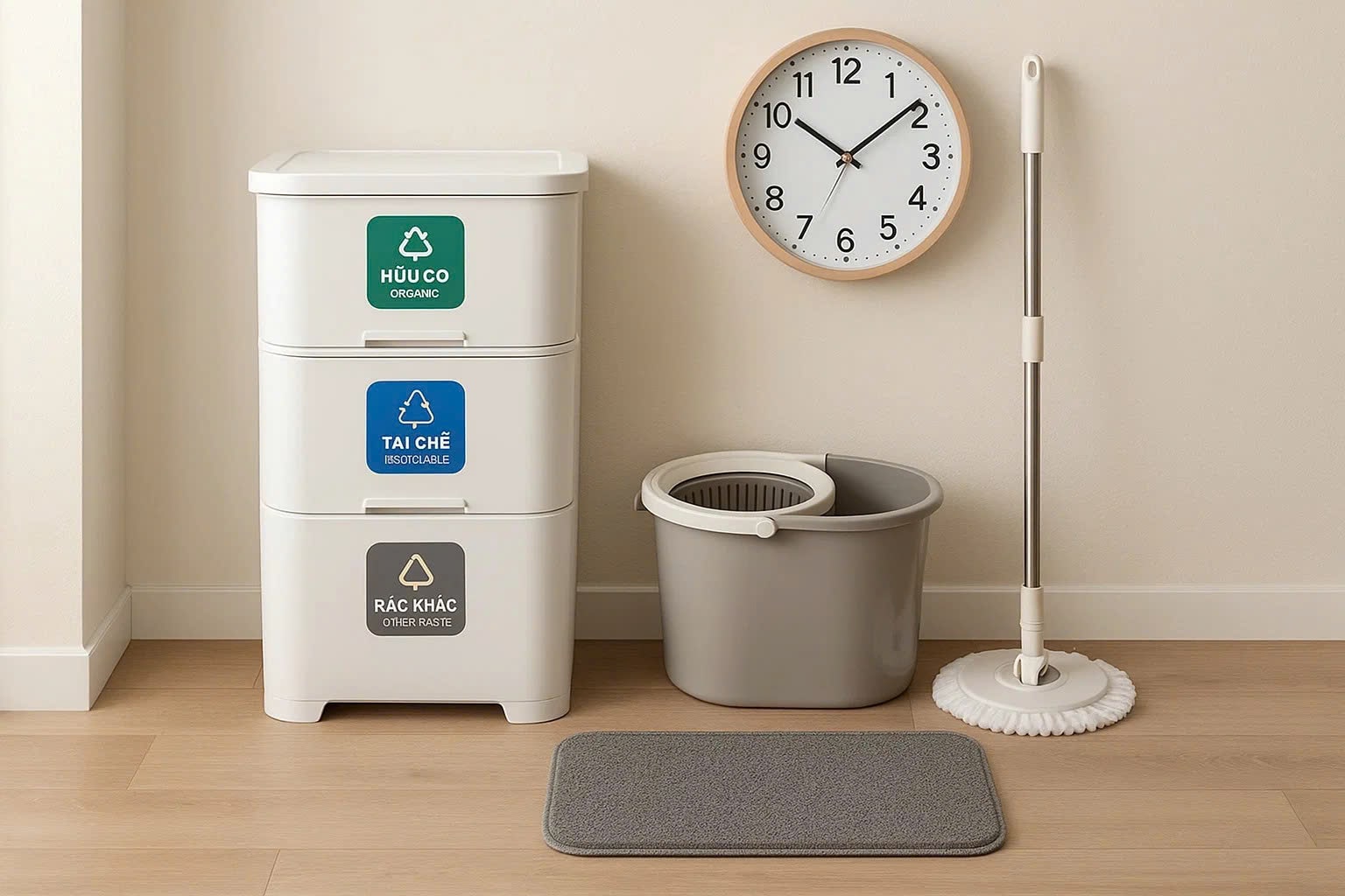Gợi ý: Bạn có thể đặt một thùng rác 3 ngăn trong bếp – nơi rác thải sinh hoạt phát sinh nhiều nhất, kết hợp với thảm lau chân trước cửa bếp để giữ sàn nhà luôn sạch sẽ, hạn chế vết bẩn khi di chuyển ra vào.
